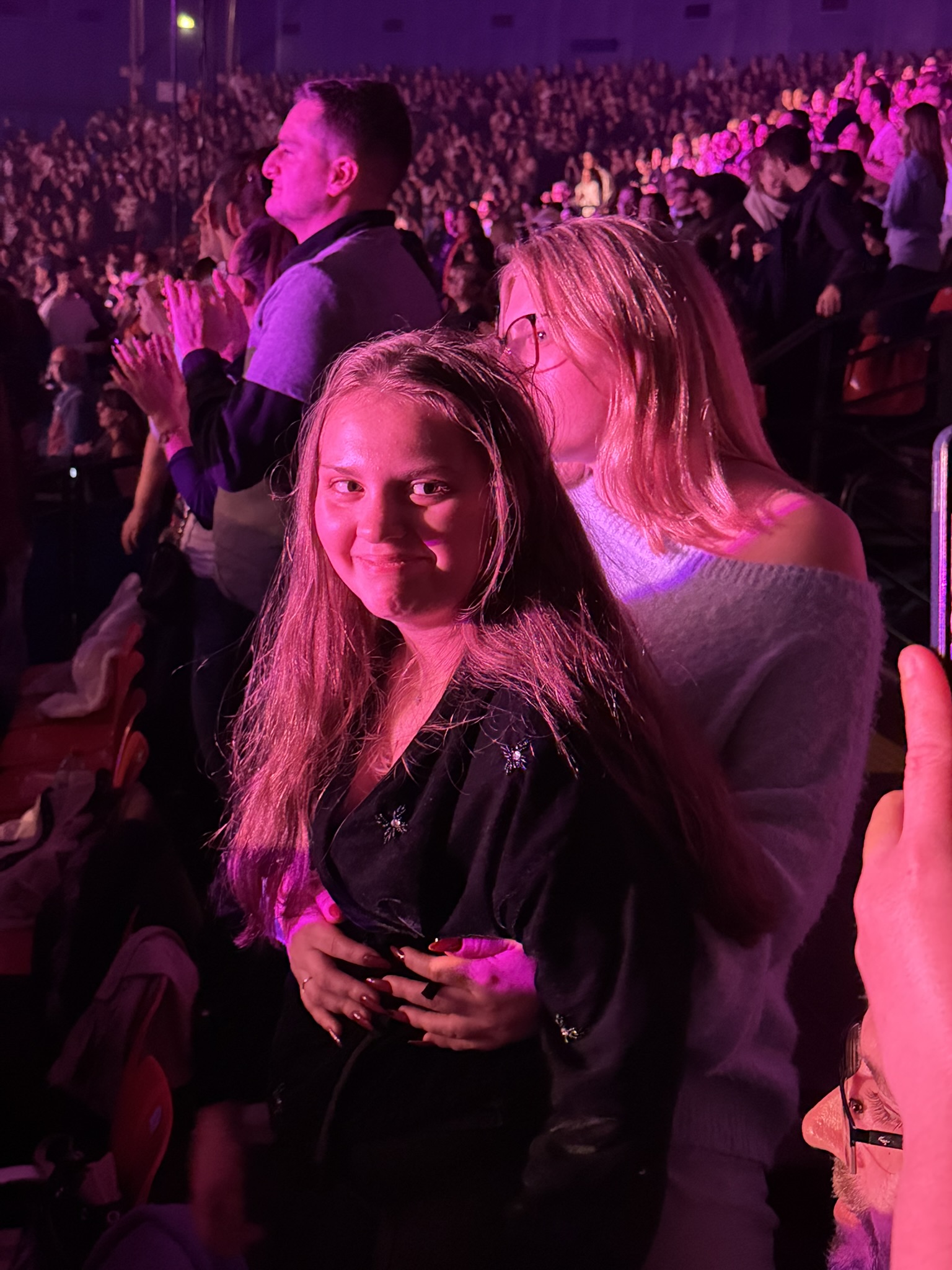 Après une pause chocolat chaud à la Philharmonie toute proche, la soirée se poursuit avec le concert tant attendu : deux heures de show, une énergie communicative entre l’artiste et son public, et Juliana aux anges dans les bras de sa sœur.